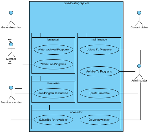 Let’s consider a broadcasting system that includes various functionalities such as broadcasting, maintenance, discussion, and newsletter management. This system involves different types of users, including general members, premium members, general visitors, and administrators.