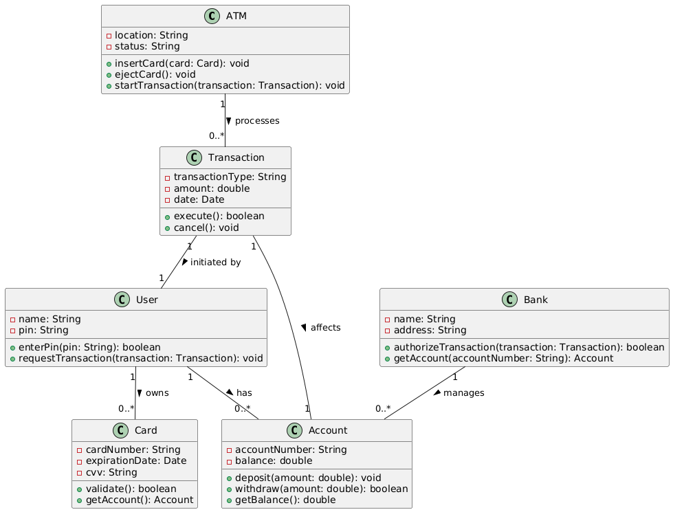 1. ATM to Transaction: The ATM processes transactions, indicating a clear association between the ATM and Transaction classes.