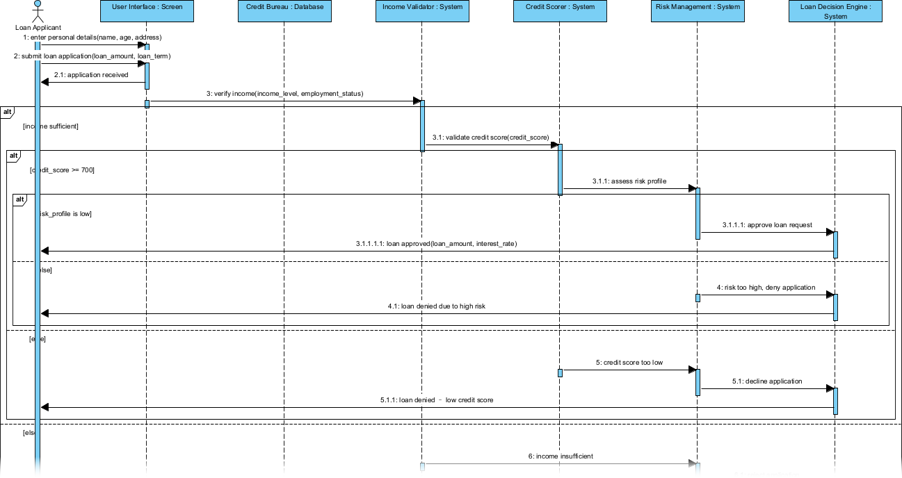 To address this, the product and engineering teams needed to model the full end-to-end approval process. A Sequence Diagram was the natural choice: it clearly shows the interaction between system components (e.g., application portal, credit API, document upload service, decision engine) and human actors (underwriters, compliance officers).