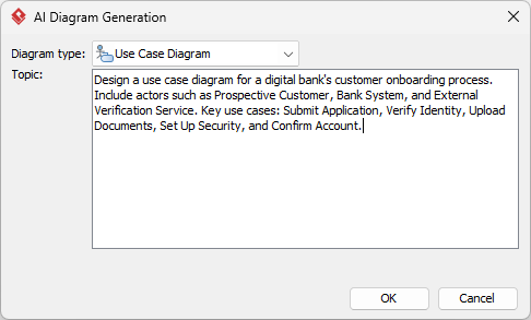 - In the AI Diagram Generation window, choose Use Case Diagram in the Diagram Type dropdown.